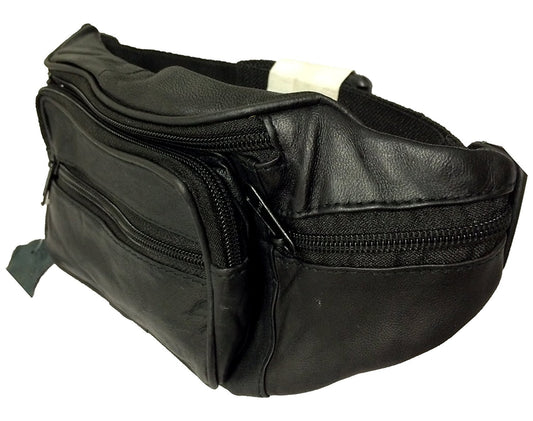 Multiple Pocket Genuine Solid (not patch) Leather Waist Pack, Fanny Pack. Large adjustable strap up to 45" Features a fold away mesh water bottle holder