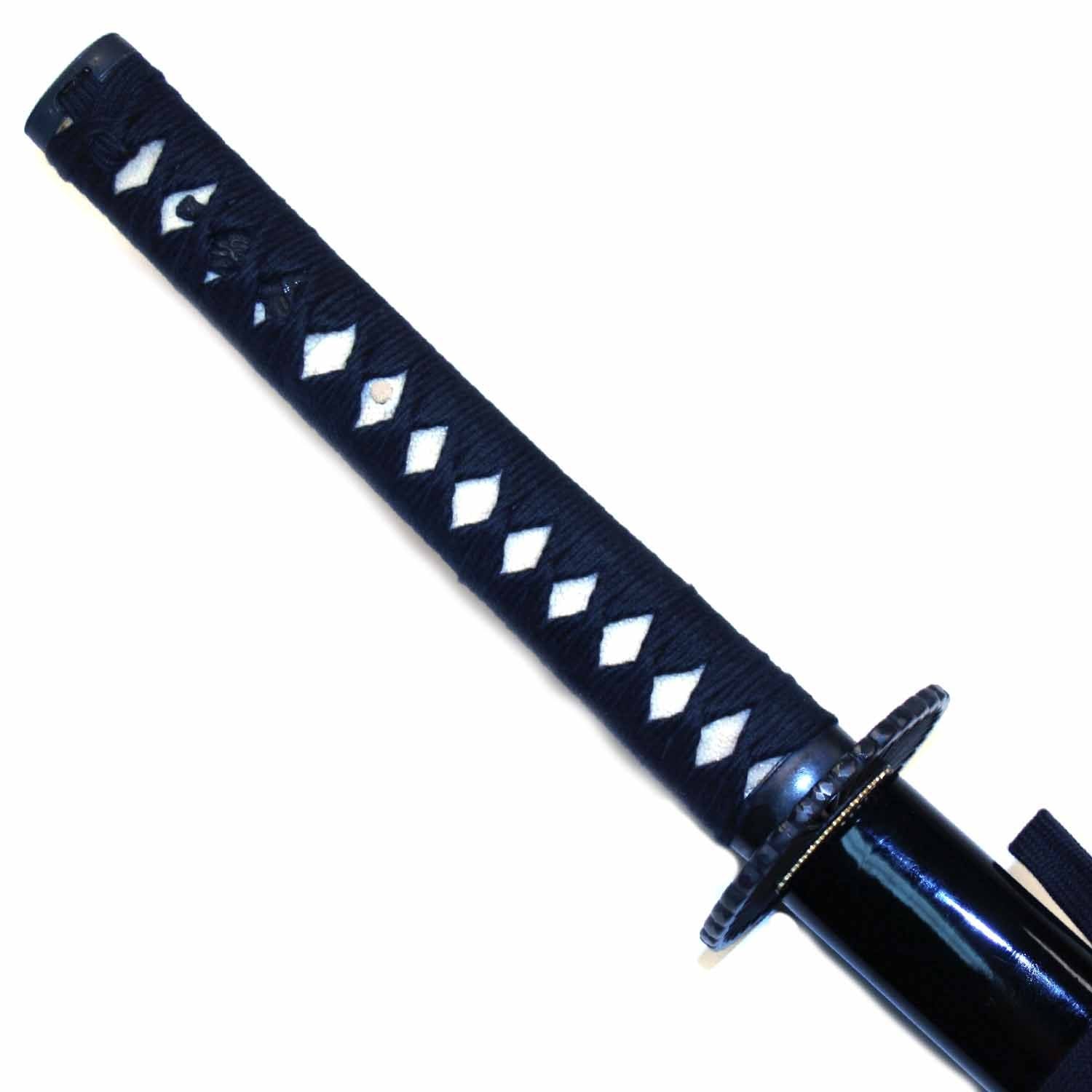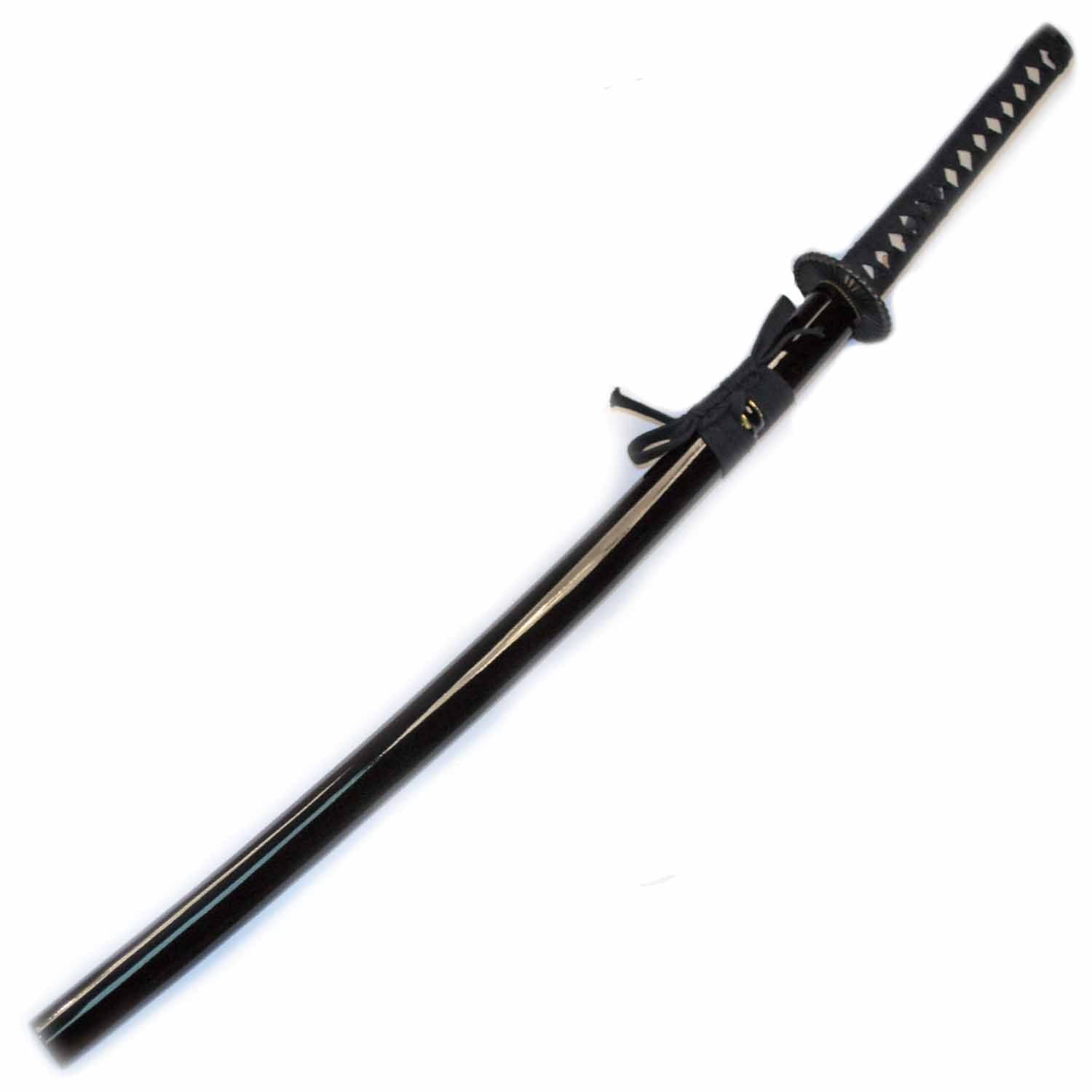 Both beginners and avid collectors will appreciate the attention to detail on this piece! The impressive 28" full tang blade of the sword has been finely crafted by hand from high-carbon steel. A bo-hi has been added to the top of the sharpened blade to provide balance and give audible feedback when the sword is swung. The wooden handle has been given a high gloss black finish and a black cotton wrap over ray skin.