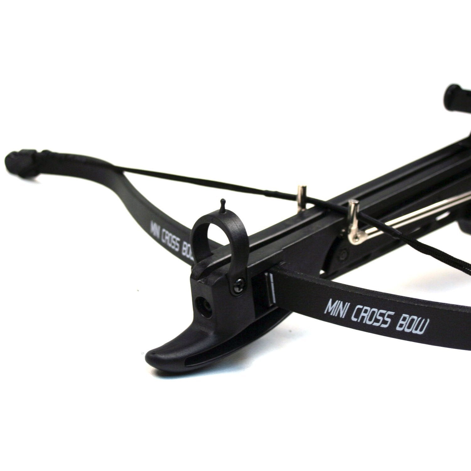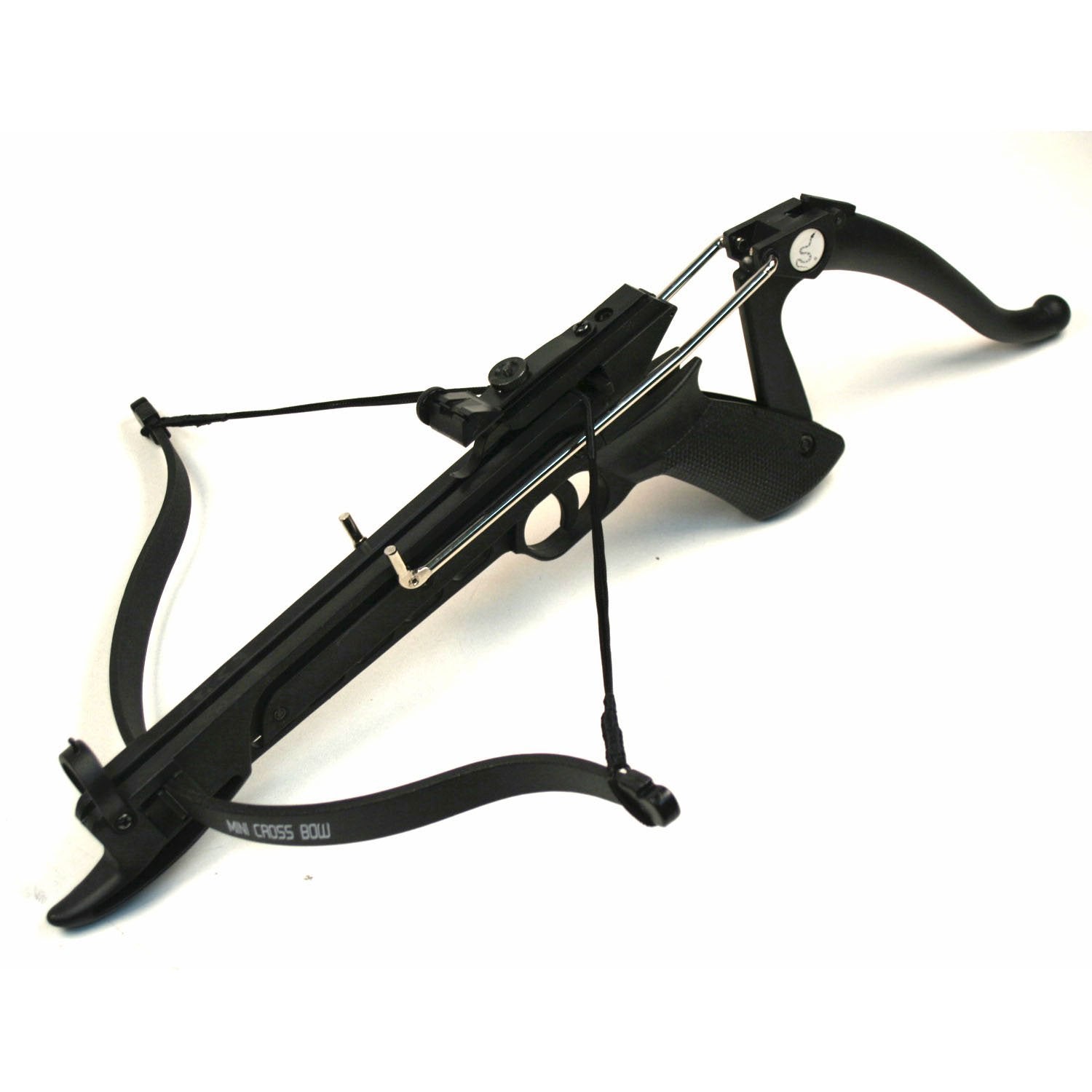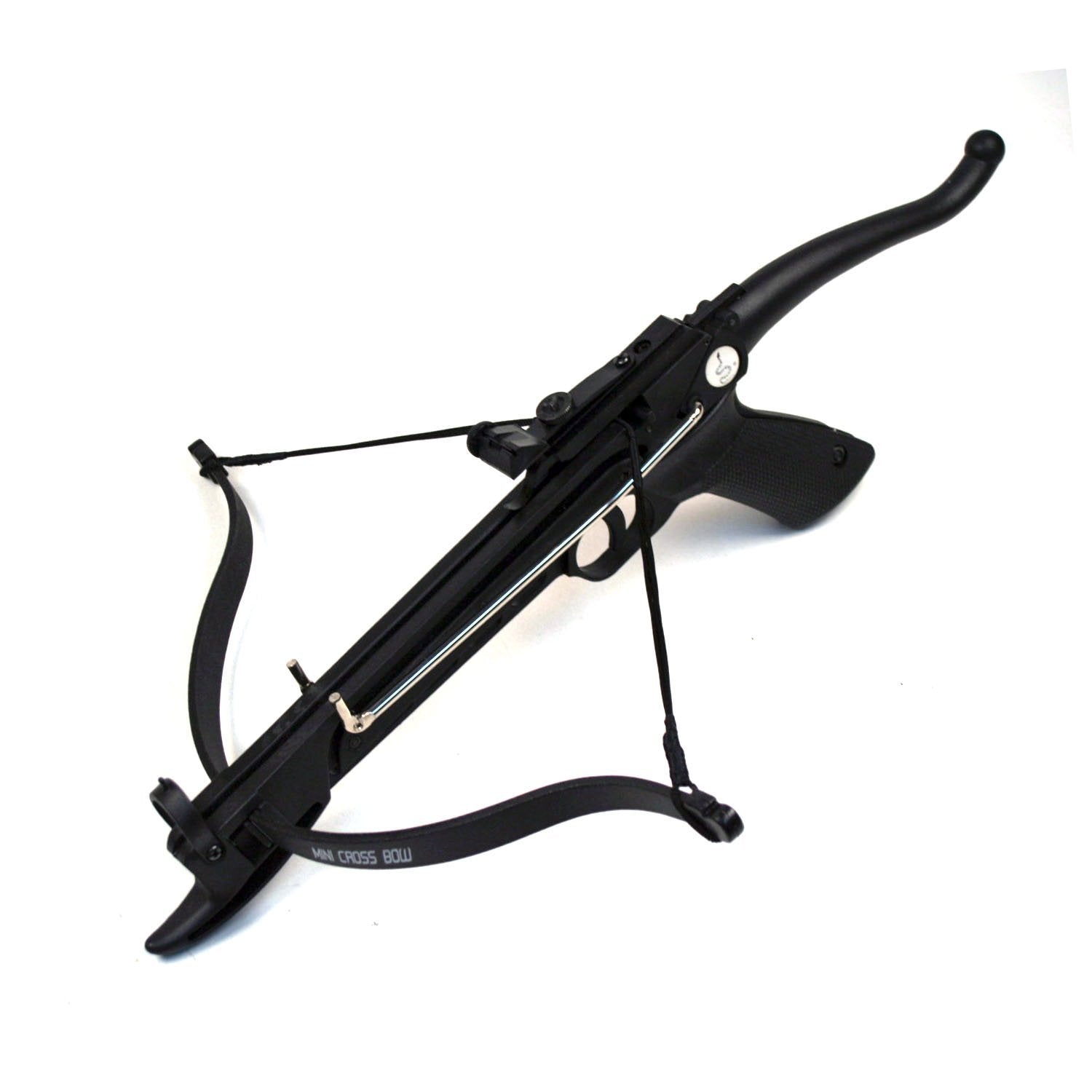 This 80 lb draw weight crossbow uses an easy and safe-to-use cocking mechanism. Manufactured with a strong plastic body and compressed molded fiberglass bow, this crossbow pistol is very durable and perfect for both small game hunting and target practice. Each crossbow includes 3 aluminum arrows with metal tips and adjustable tactical sight. With a firing speed of 165 fps, the 80 lb cross bow is great for hunting small game. The new self-cocking mechanism much more safe and far less strenuous to use. By simply pulling down on a pivoting arm lever, this crossbow's cable is cocked much more easily, even engaging the safety automatically. The speediness of the new cocking mechanism shortens reload time, allowing you to get off more shots quickly. Like all hunting weapons and gear, proper maintenance is essential in prolonging the life of your crossbow. With each use, elements of the crossbow can begin to wear. We also recommend applying rail lube often to your crossbow's rail slide and wax to your string to decrease the friction that can hurt your string. It's also recommended to check the tightness of your crossbow's screws often as vibration can loosen them overtime.