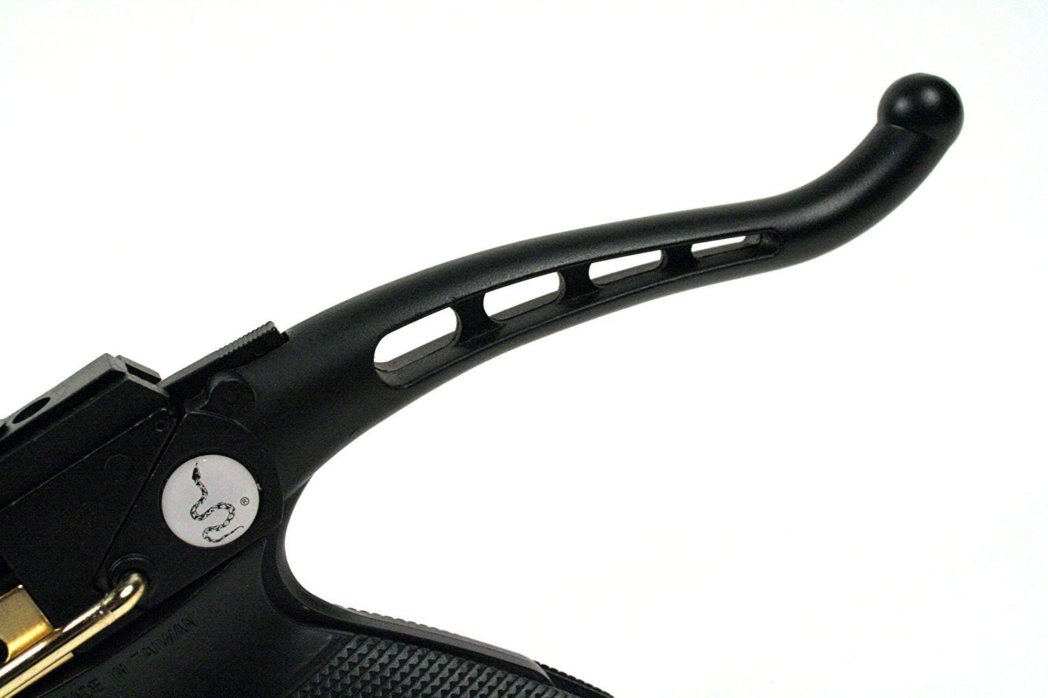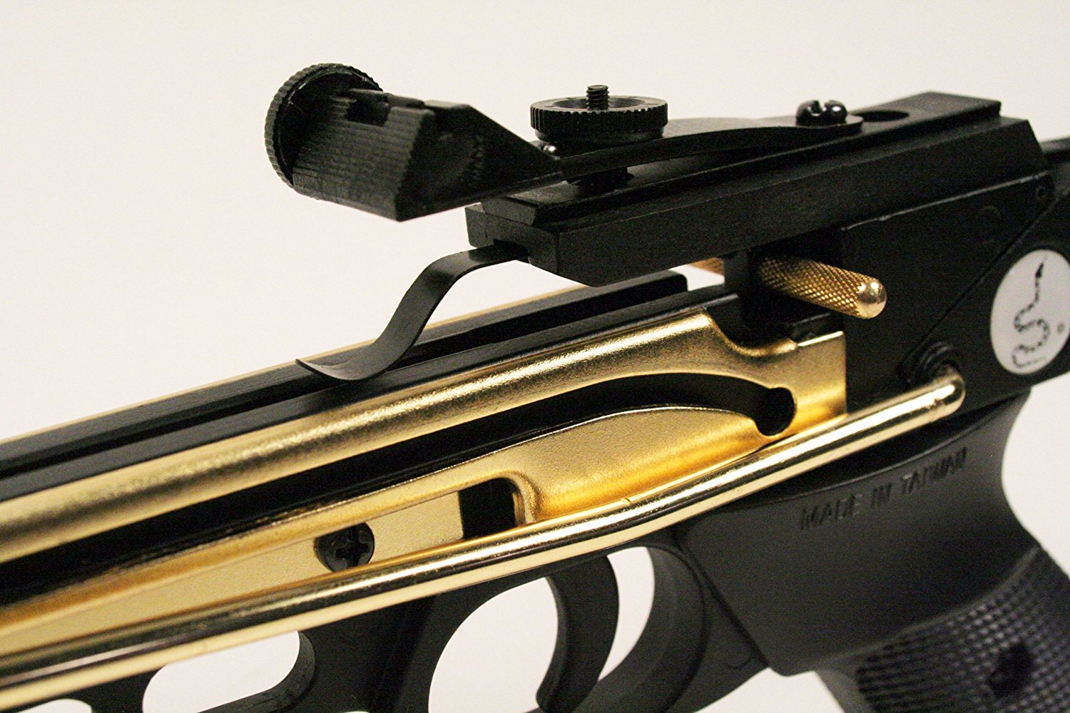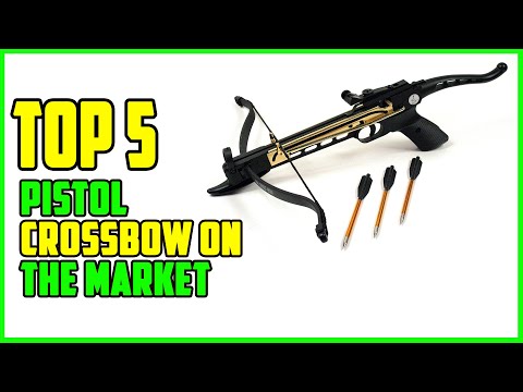 - Pistol-style, self-cocking crossbow with strong plastic body and compressed molded fiberglass bow