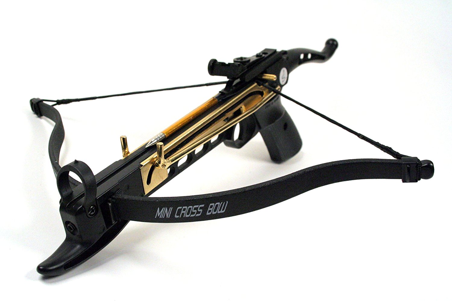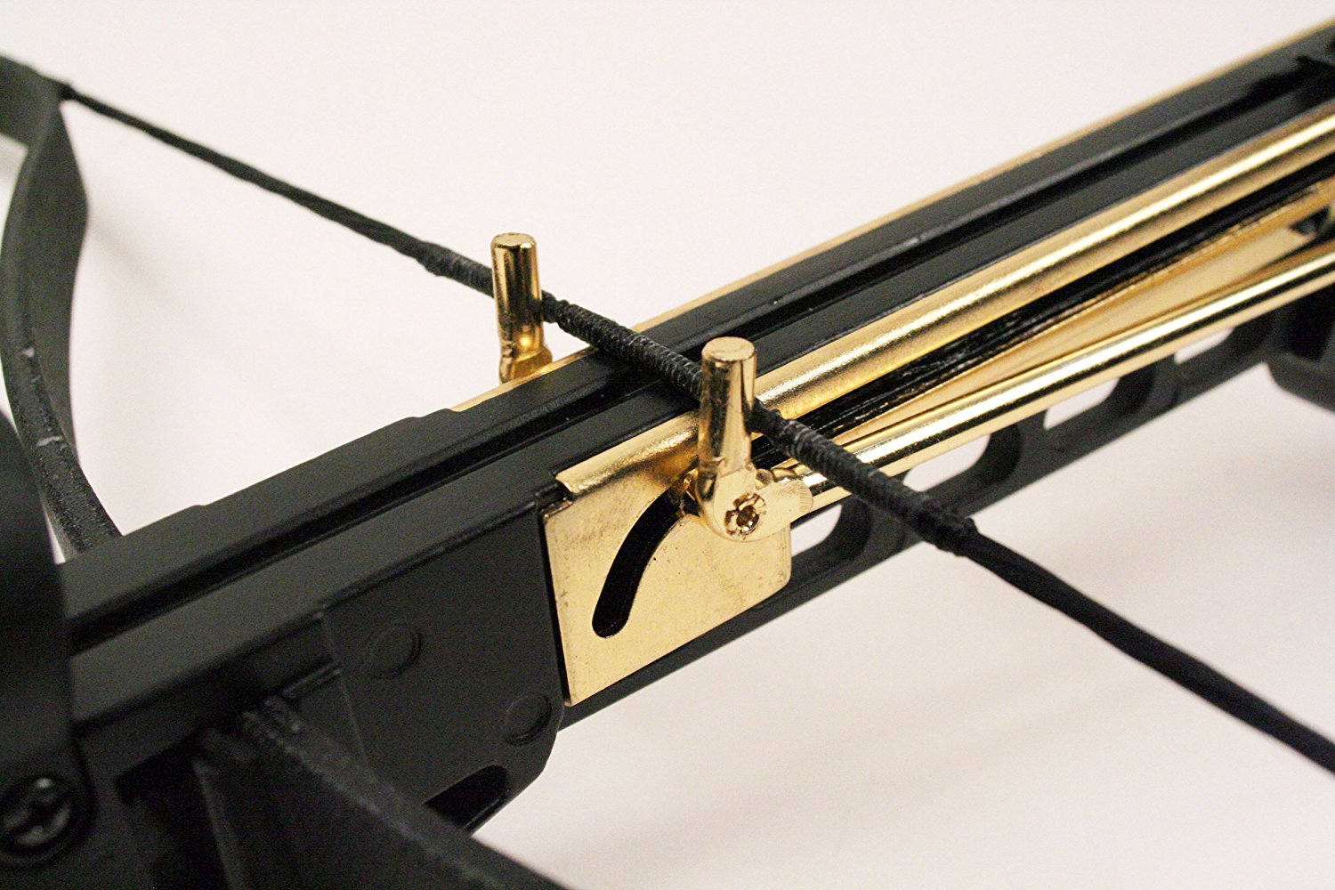 This 80 lb draw weight crossbow uses an easy and safe-to-use cocking mechanism. Manufactured with a strong plastic body and compressed molded fiberglass bow, this crossbow pistol is very durable and perfect for both small game hunting and target practice. Each crossbow includes 3 aluminum arrows with metal tips and adjustable tactical sight. With a firing speed of 165 fps, the 80 lb cross bow is great for hunting small game. The new self-cocking mechanism much more safe and far less strenuous to use. By simply pulling down on a pivoting arm lever, this crossbow's cable is cocked much more easily, even engaging the safety automatically. The speediness of the new cocking mechanism shortens reload time, allowing you to get off more shots quickly. We also recommend applying rail lube often to your crossbow's rail slide and wax to your string to decrease the friction that can hurt your string. It's also recommended to check the tightness of your crossbow's screws often as vibration can loosen them overtime.