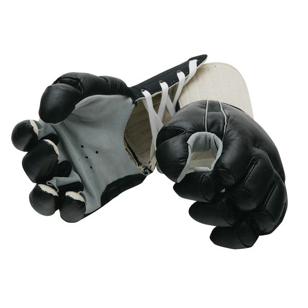 Extra padded canvas ribbed wrist and forearm for full protection. Black leather lace-up gloves with jointed knuckles for flexibility. These gloves are also known as the Bruce Lee gloves.