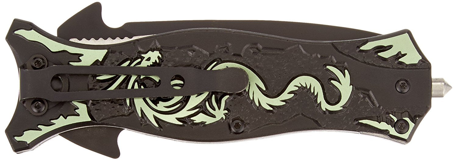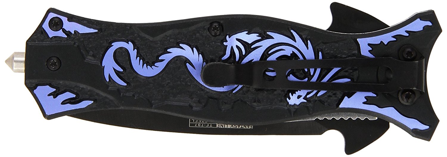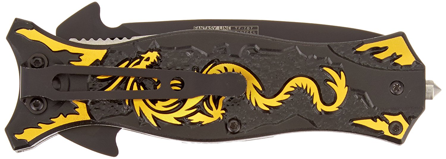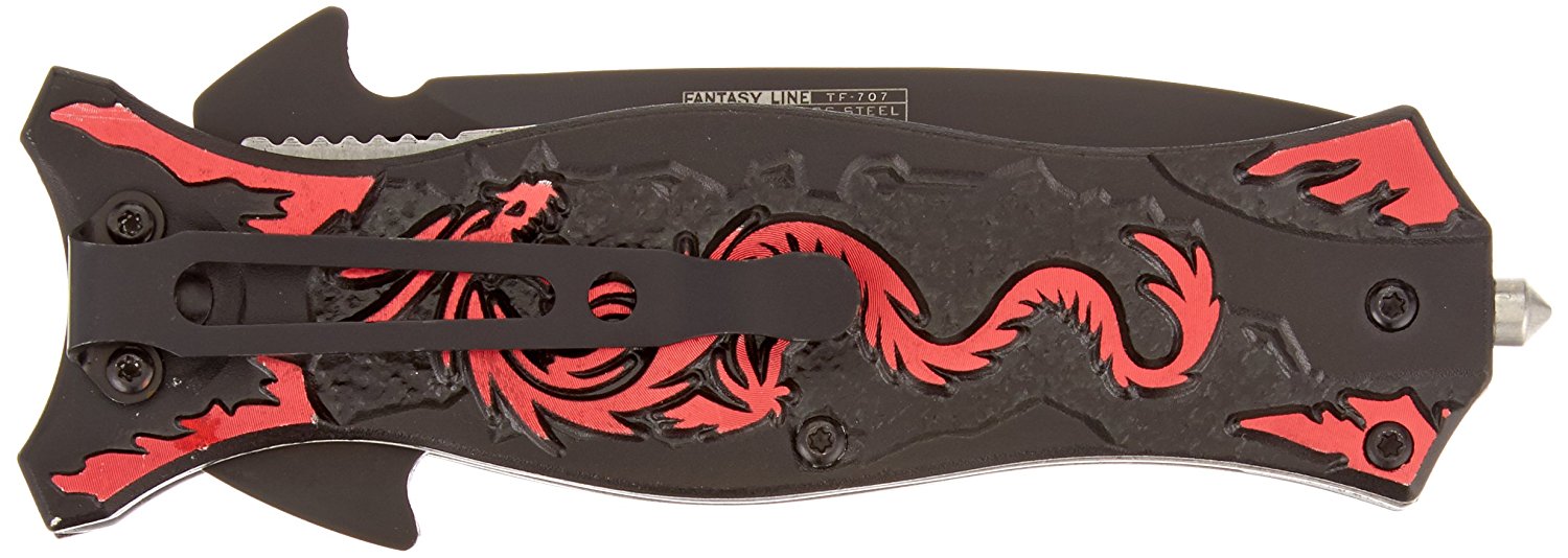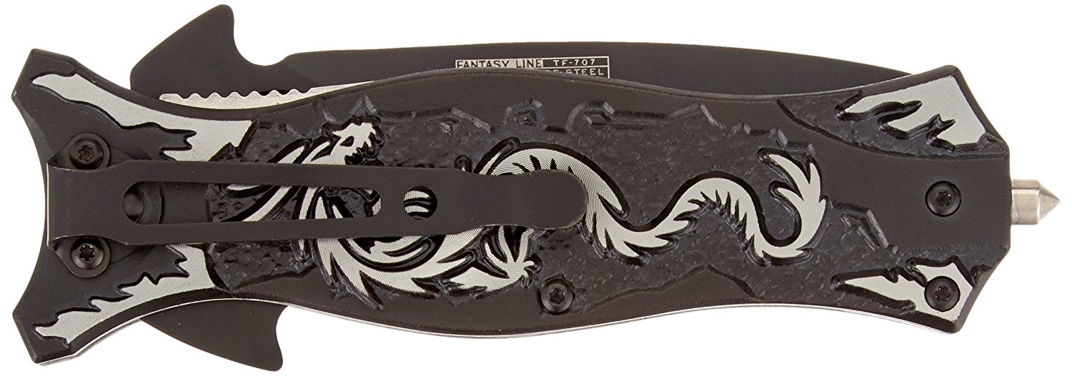 The TAC Force Assisted Opening Folding Knife (TF-707 Series) features a black half-serrated blade and a dragon design handle, with a 4-1/2-inch closed length. Offering easy one-handed deployment, this spring assisted open folding knife locks securely into place with the use of its liner lock. This knife features a 3-1/2-inch, 3mm thick stainless steel blade. The aluminum handle has a dragon pattern on it, plus a finger hole on the end for added control and a glass breaker on the end, which can punch out the window of a car in an emergency. It also has a pocket clip for easy and safe carry. TAC Force designs spring assist folding knives that offer the rapid deployment desired by EMTs, Fire/Rescue, and first responders. They're available in a wide range of styles -- from hunting to tactical and collectibles to fantasy.