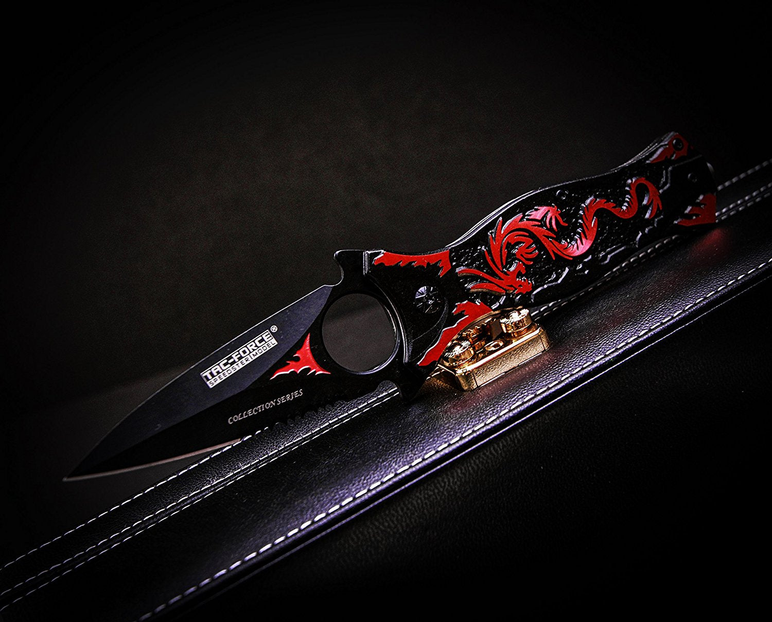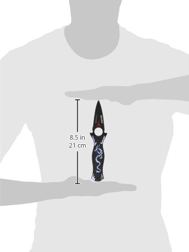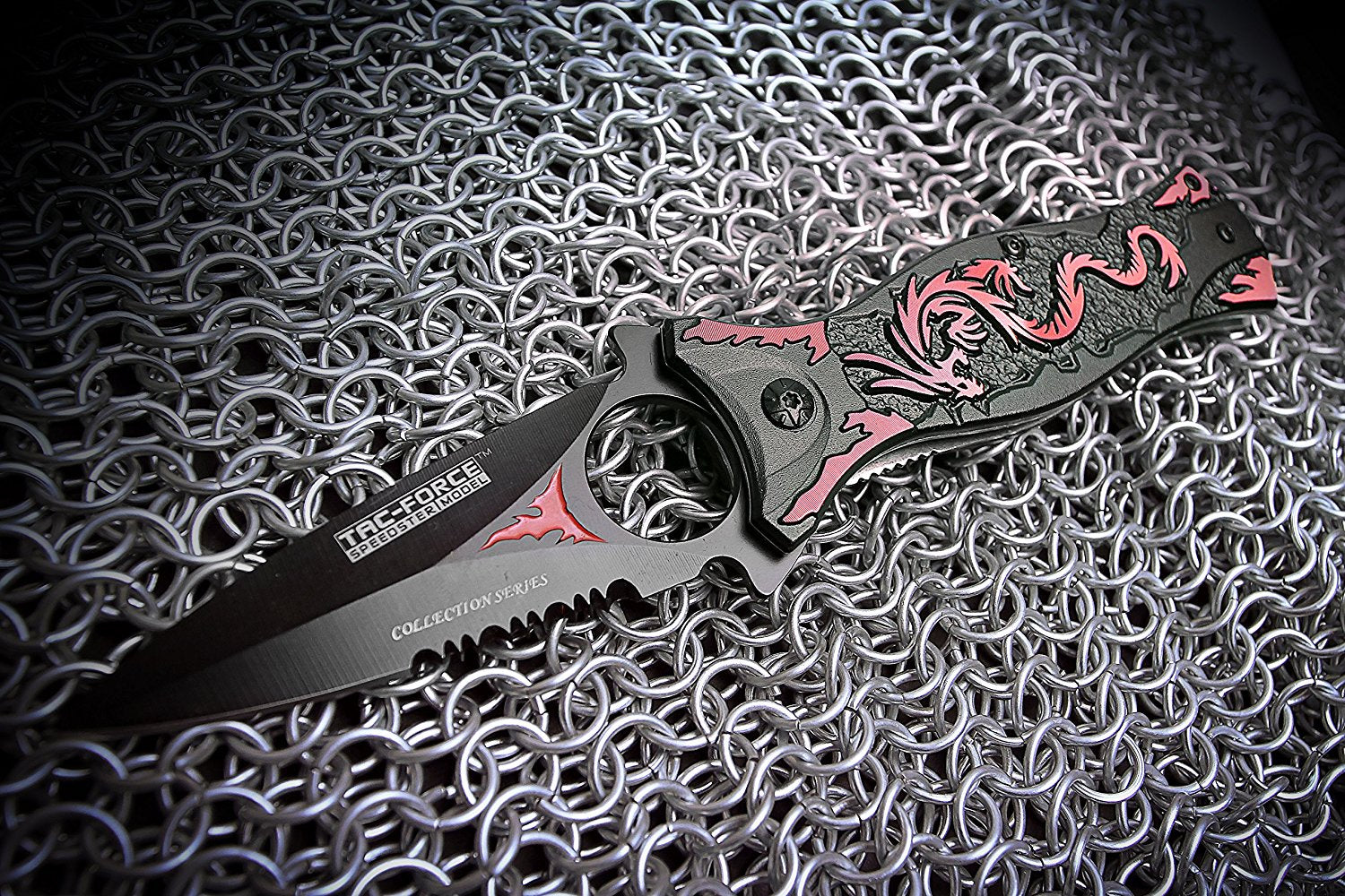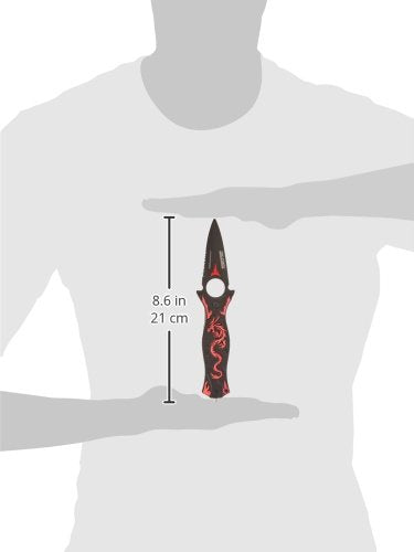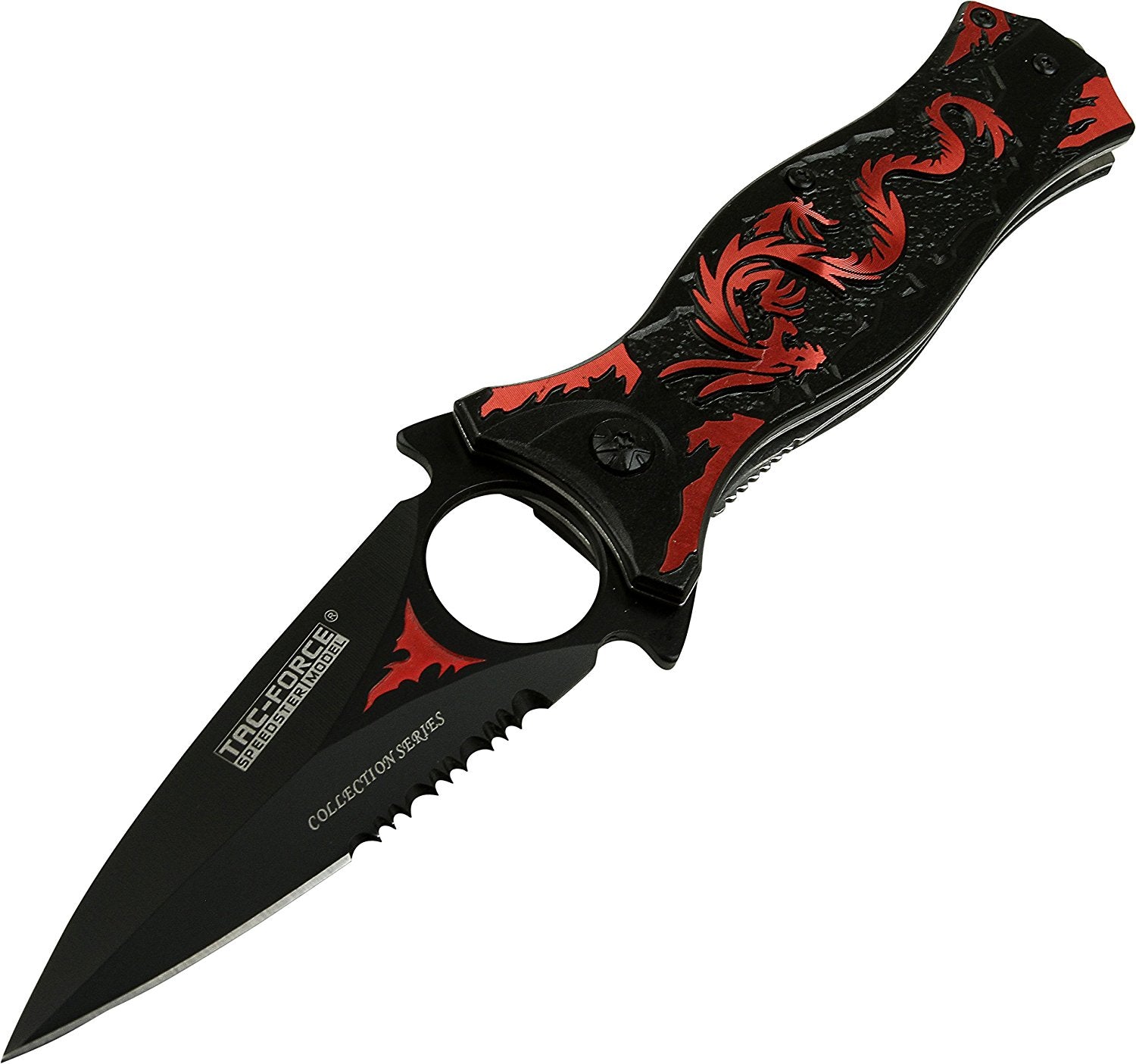 The TAC Force Assisted Opening Folding Knife (TF-707 Series) features a black half-serrated blade and a dragon design handle, with a 4-1/2-inch closed length. Offering easy one-handed deployment, this spring assisted open folding knife locks securely into place with the use of its liner lock. This knife features a 3-1/2-inch, 3mm thick stainless steel blade. The aluminum handle has a dragon pattern on it, plus a finger hole on the end for added control and a glass breaker on the end, which can punch out the window of a car in an emergency. It also has a pocket clip for easy and safe carry. TAC Force designs spring assist folding knives that offer the rapid deployment desired by EMTs, Fire/Rescue, and first responders. They're available in a wide range of styles -- from hunting to tactical and collectibles to fantasy.
