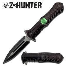 The benefit of a good folding nice is quite easy to see. It's small, light-weight, and in the case of this Z-Hunter Biohazard Black Folding Knife, it's quick to deploy, making it a solid choice for any zombie hunter or apocalypse survivor to carry. This handy little knife is made from stainless steel and black aluminum, giving it a hardy construction that won't soon fail. The grip is textured and contoured to fit easily into your hand, while the two-toned, black and silver blade features a spear-point design that is wildly effective at both cutting and piercing. The edge is also half-serrated, allowing for an effective saw-like motion that can be used as well. The blade is action assisted, which allows for quick and easy opening, while the black handle is set with a green bio-hazard medallion, to better echo the look and feel of an apocalyptic, zombie infested setting. The knife also features a pocket clip for easy, convenient carrying. It is small and effective, and that makes this Z-Hunter Biohazard Black Folding Knife a great choice to add to your survival kit, as well as an effective knife to tuck into your pocket for everyday use, too. Overall Length (Closed): 4.75 inches